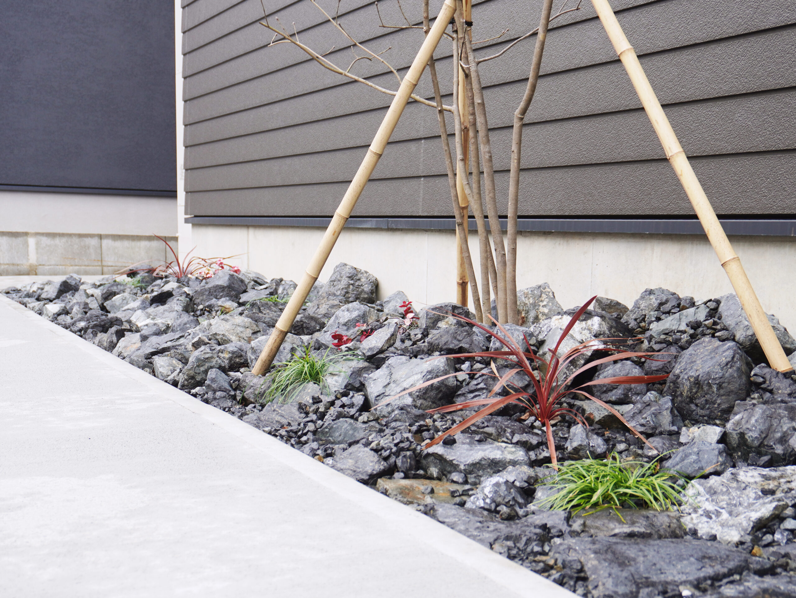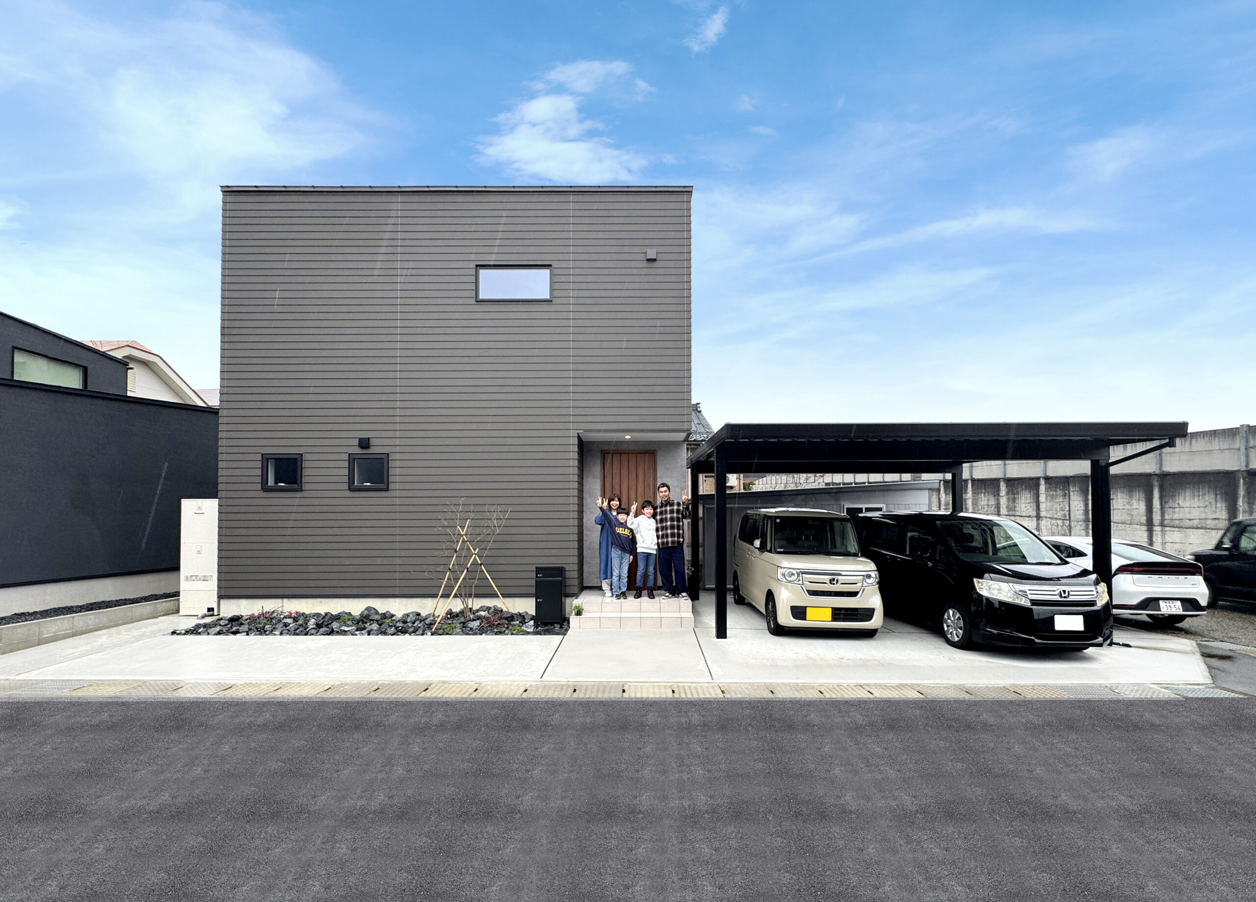 外観の色もすごく悩みました…。最初は真っ黒がいいと話していましたが若槻さんのご提案で「チャコールブラウン」に仕上げて、玄関先にも植栽としてアオダモを植えてもらいました!結果大正解だったと感じています!