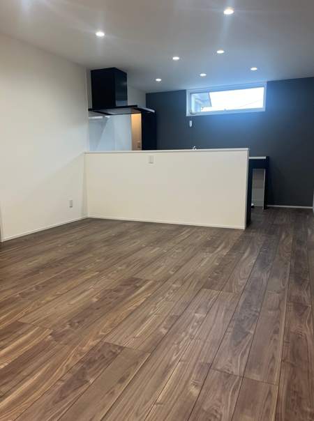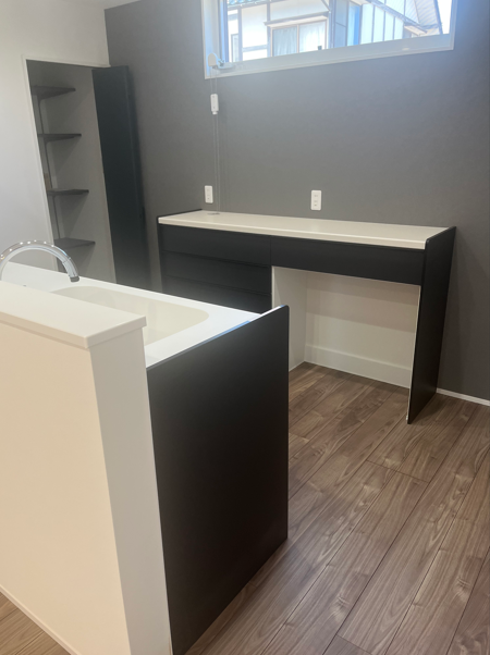 「書斎のような落ち着き」と「家事効率」を両立させたキッチンスペース。 背面のカップボードは、ブラックの面材とグレーのアセントクロスを組み合わせ、シックでモダンな印象に仕上げました。