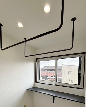 生活感が出がちな「干す」という作業を、もっとおしゃれに。白を基調とした清潔感のある空間に、ブラックのラインを効かせたモダンなランドリールームのご紹介です。