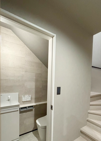 階段下の限られたスペースを最大限に活かしたレストルームの事例です。 圧迫感を感じさせないよう、斜めの天井ラインをデザインの一部として取り込み、膨張色である明るいグレーのアクセントクロスを採用しました。