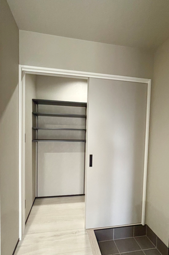 玄関横に設けられた、隠せる大容量のシューズクローク。 あえて扉を設けることで、急な来客時でも玄関周りを瞬時にスッキリとした印象に。 壁紙と建具の色調を揃えた「ワントーン」のコーディネートが、奥行きを感じさせつつ、住まい全体に洗練された統一感をもたらします。