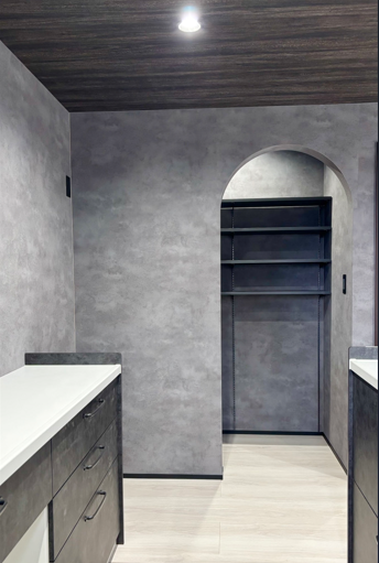 キッチン横に設けられたパントリーは、扉をあえて作らないオープンなアーチ開口に。 両手がふさがっていても出入りがスムーズで、忙しい家事時間をサポートします。 内部は可動棚を採用し、ストック品や家電のサイズに合わせてカスタマイズが可能。 「隠す」のではなく「空間に溶け込ませる」収納デザインをご提案しました。